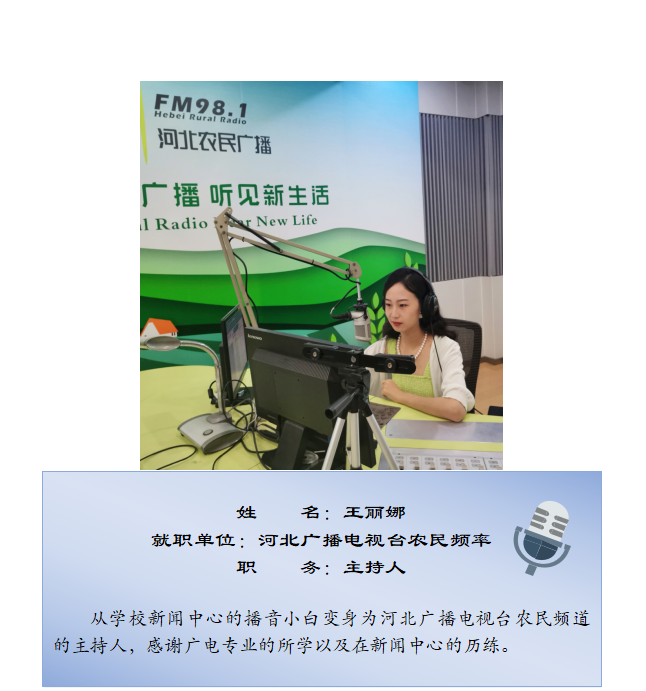 依托新闻传播学一级学科,紧跟广播电视与新媒体融合发展趋势,致力于培养具有正确政治立场、精通广播电视理论和实践技能,具备音视频创作和新媒体技术应用能力的复合型人才。历届员工作品屡获各类国家级、省级奖项,并在中央电视台、“学习强国”平台、河北广播电视台、长城网、石家庄电视台等媒体展播。