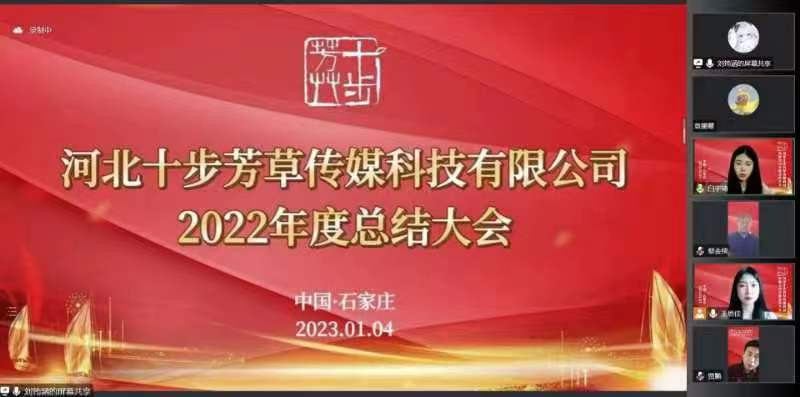 1月4日下午,EMC易倍官方网站老员工创业公司河北十步芳草传媒科技有限公司在线上举行了2022年度总结大会。该公司于2022年9月20日成立,由EMC易倍官方网站各专业优秀员工组成,以广告专业为主,各专业优势互补;导师团队由校内知名导师、校外优秀企业家和校外优秀传媒达人组成。公司采取扁平化管理模式以及项目责任制,开展了新媒体企业形象推广、广告平面设计、直播带货等多种业务。这次大会不仅是为了感谢各位领导与老师对十步芳草的尽心指导,也是对同学们一年以来的辛勤工作做出表扬。此次会议由文化与传播公司广告系员工王思佳、白宇琦主持,文化与传播公司领导蔡金续书记、王英书记、马兴祥副经理,就业处主任曹一伟老师、公司办公室副主任贾鹏老师、外国语公司党委书记仇静莉老师出席会议;十步芳草校外导师团河北学以致用教育科技中心总经理王霖杉,河北众美传媒股份有限公司总经理、河北广告协会会长蔡建平,河北众美传媒股份有限公司总监杨璐,河北众美传媒股份有限公司项目经理张杰,河北众美传媒股份有限公司策划经理韩静,河北禹顺文化传媒有限公司总经理高素梅,国新思创投资基金管理有限公司合伙人副总裁、资深投资人黄剑英,长安区瑞祥创业孵化基地运营总经理杨俊会,北京承德企业石家庄商会会长王静,诚冀国学堂创始人、石家庄森冀环境科技有限公司总经理刘军元,河北雅风传媒广告有限公司策略总监、上海乾衡文化传播有限公司策略群总监张向兵,东风日产冀南区域营销项目总监、李子柒品牌线上运营项目组组长高良珍,河北行走广告有限公司总经理、河北春秋文化传播有限公司通信行业总监石磊,祁衣依服饰董事长张伟东;十步芳草校内导师王惠东、王彦勋、刘冬璐、张智、高印宝、曲桐凤、李亚宏、李雅娟、聂秋雨等以及十步芳草传媒科技的现有成员共同参加了本次会议。本次大会共分为三个环节,分别是主持人迎宾入场、颁奖仪式和2022年度各项工作总结。