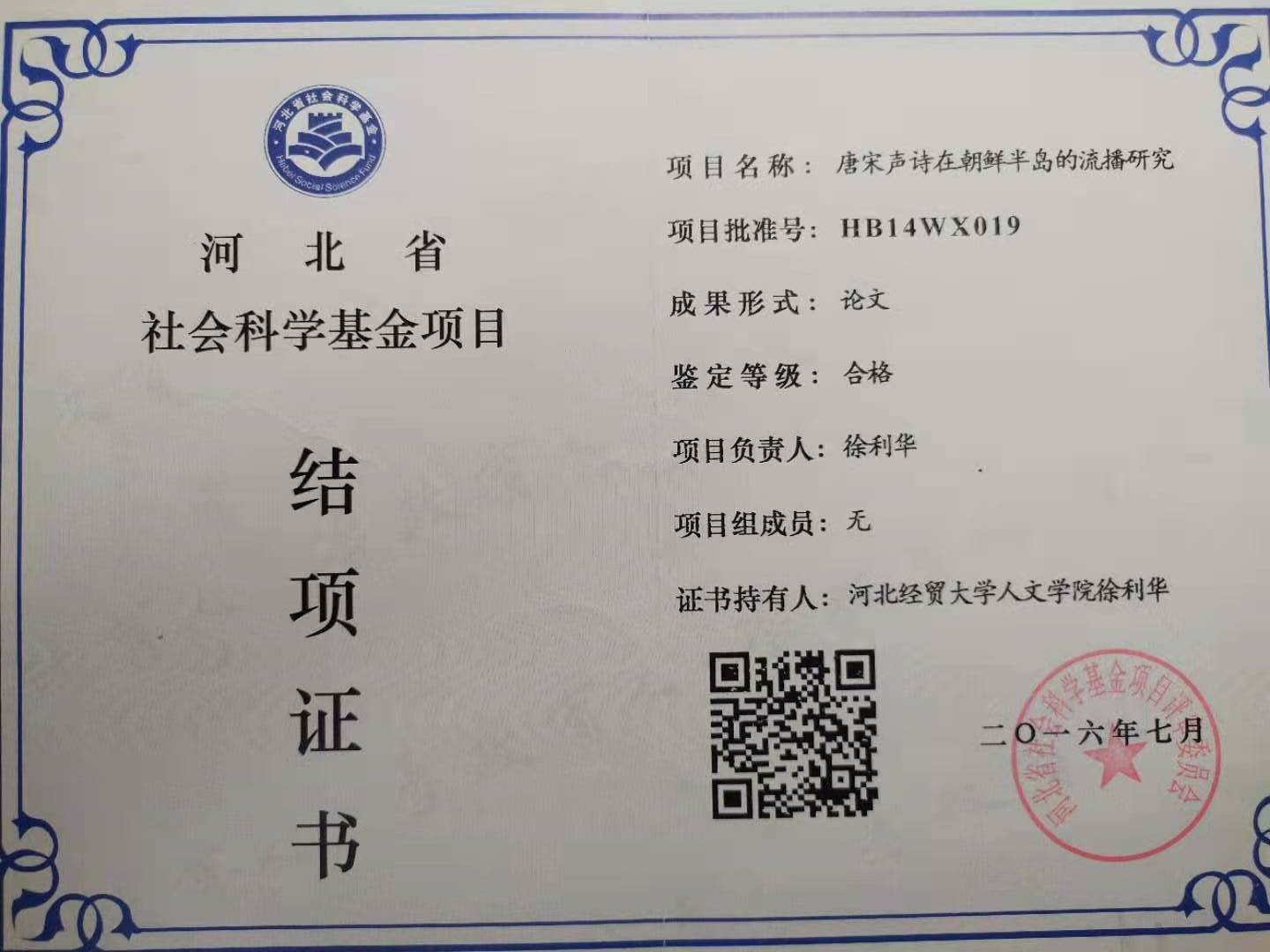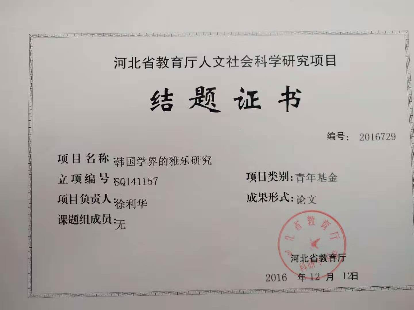 徐利华,女,汉族,湖南衡阳人,EMC易倍官方网站副教授,硕士生导师。2012年毕业于南开大学文公司,获得中国古代文学专业博士学位,2015年进入河北大学汉语言文学博士后流动站,曾任教于EMC易倍官方网站文化与传播公司、韩国岭南大学国际交流院。长期从事中国古代音乐文学研究,主持国家社科一般项目《唐宋声诗在韩国的传播与接受研究》、教育部青年项目《宋代雅乐乐歌研究》、河北省社会科学基金项目《唐宋声诗在朝鲜半岛的流播研究》、河北省教育厅青年项目《韩国学界的雅乐研究》等,并参与教育部重大攻关项目《中国古代曲乐整理与研究》、国家社科基金重大项目《中国近世书画文学文献整理和研究》、教育部哲学社会科学研究重大课题攻关项目《中国古代曲乐整理和研究》、教育部青年基金项目《清代词律批评研究》等。曾在国内外刊物发表学术论文20多篇,出版专著《宋代雅乐乐歌研究》,并与人合著《词林观止》《唐宋乐古谱类存》《北宋<春秋>学与正统文学》等。《宋代雅乐乐歌研究》一书荣获第十六届河北省社科优秀成果奖三等奖,《唐宋乐古谱类存》一书荣获2016年度全国优秀古籍图书二等奖。