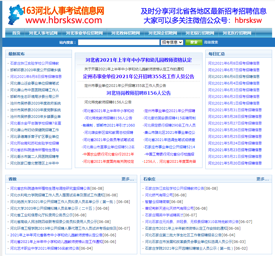 三、河北省招聘信息:河北人社微信公众号、163河北人事考试信息网网站(微信公众号:163河北人事考试信息)