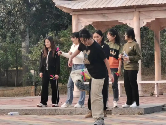 紧接着是踢毽子环节。每队各派出代表,在裁判一声令下,同学们迅速开始动作,队员们则在一旁高声呐喊助威。王桦同学流畅的动作引得全场欢呼,邓亚婷同学更是以70次的佳绩为队伍夺得本轮冠军。
