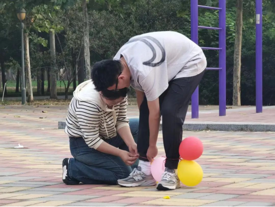 最后一项踩气球游戏,各队代表在自己的脚上绑上固定数量的气球,随着裁判一声令下,大家开始激烈的对抗,在保护自己脚上气球的同时要踩爆其他人的气球。在两轮比拼结束后,张丰同学的队伍保留最多的气球并取得胜利。