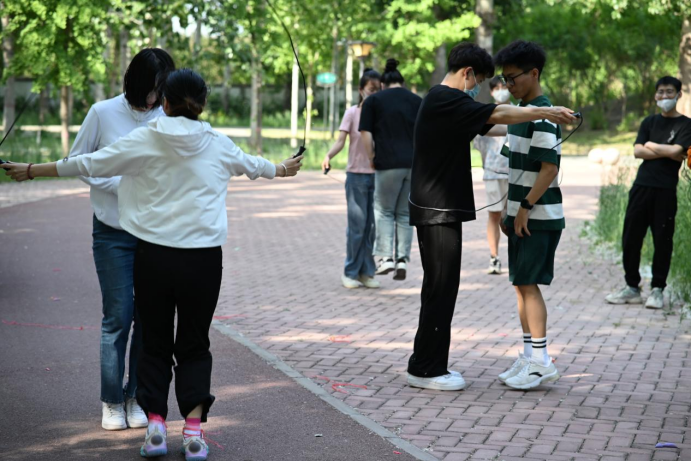 第三个项目是跳绳,这是一种合作游戏,考验队员们团结协作、互相配合的能力。场上长绳飞舞,队员们相互鼓励。参赛队员们在团结一致的跳跃间,以饱满的热情和敏捷的身姿奋力争先,真正做到了“绳”采飞扬。