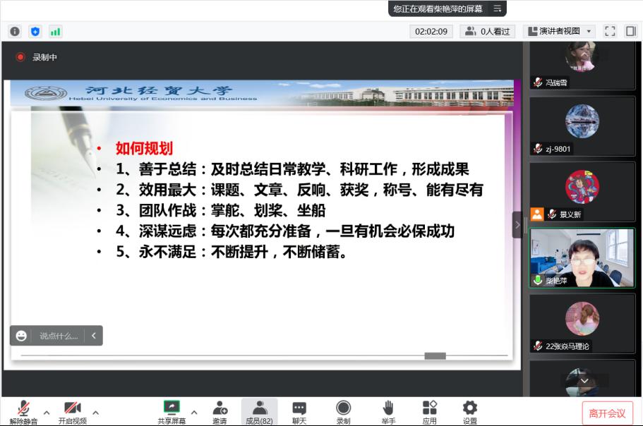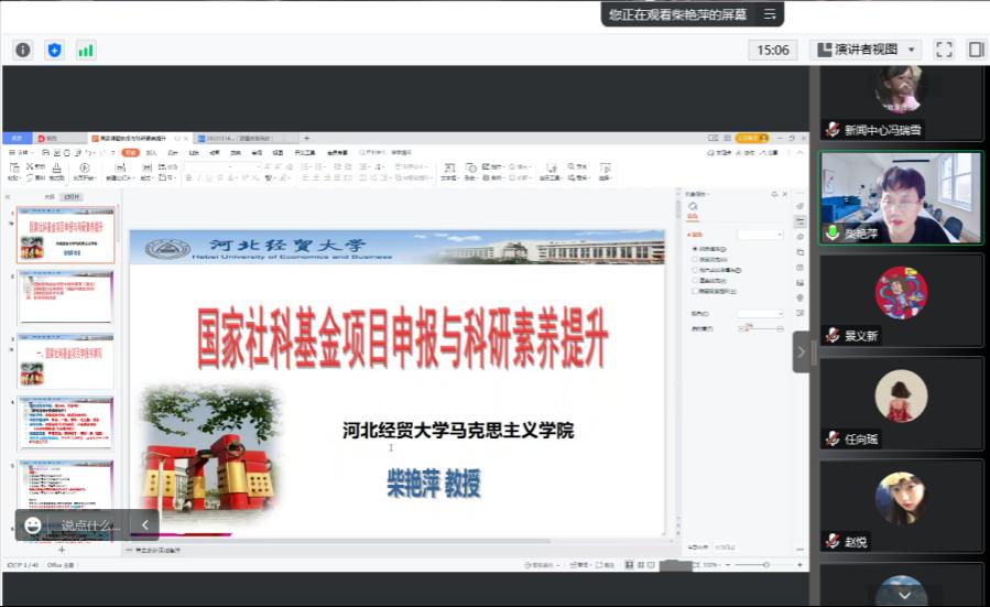 11月21日下午,文化与传播公司邀请马克思主义公司经理柴艳萍作题为“国家社科基金项目申报与科研素养提升”的“双百论坛”线上学术讲座。讲座由文化与传播公司经理景义新主持,多个公司师生90余人参加。
