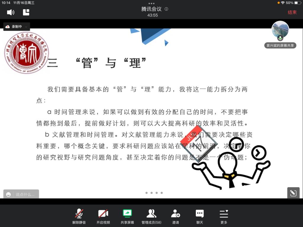 11月16日上午,文化与传播公司窦兴斌副教授作题为“按开学术之门的通用密码”的“双百论坛”线上学术讲座。讲座由公司广播电视学系主任王黎燕主持,公司部分教师和研究生60余人参加。