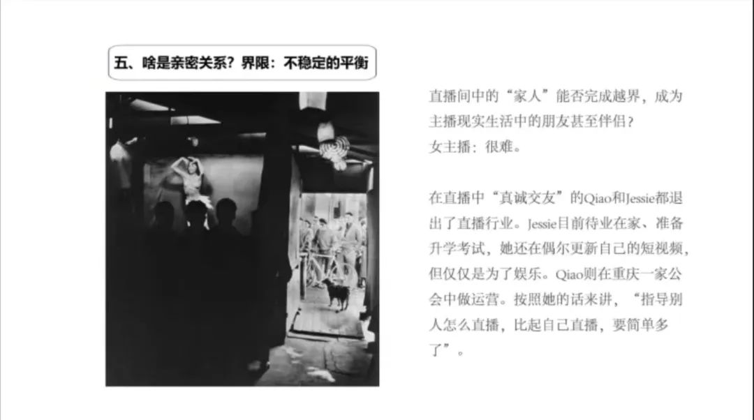 郭可宇同学分享的是《做主播:一项关系劳动的数码民族志》,首先说明了直播用户多,根据第45次《中国互联网络发展状况统计报告》的统计,截至2020年3月,中国网络秀场直播的用户规模达到2.07亿,成为互联网中一项重要的经济产业。随后指出既有研究往往借用情感劳动这一概念,聚焦于直播平台与公会如何异化和剥削从业者。然而,这一取向一方面在很大程度上忽略了主播作为劳动者的主观体验;另一方面,情感劳动在解释主播工作实践的过程中也显现出局限性。最后指出本研究基于12个月的数码民族志,通过将“关系劳动”与“平台化”这两个理论视角加以结合,考察了秀场主播如何理解并实践自己与观众在直播间内/外形成的经济关系与亲密关系,并梳理出“标价”“区分”和“界限”三种行动策略。在此基础上,本研究进一步对关系劳动、平台化与秀场主播的主体性这三个概念进行了理论反思。