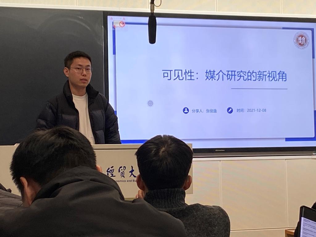 张俊逸同学介绍了《可见性:媒介研究的新视角》,从可见性理论的起源、从受害叙事到剥夺叙事、新闻即“表演”、戴扬的自我总结四方面论述了可见性,并对可见性在国内外的研究现状做了总结,给大家带来了媒介研究的新思路。