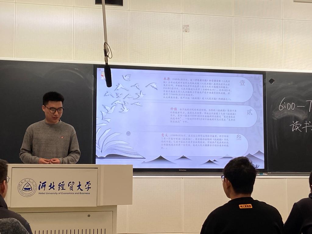 刘烨同学分享的是《中国共产党晋察冀边区出版史》,主要从晋察冀边区的创建与发展、晋察冀边区机关团体的新闻出版事业、晋察冀杰出报刊人三方面对中国共产党晋察冀边区出版史做了整体论述,最后以自己此次读书感悟与思考结尾。