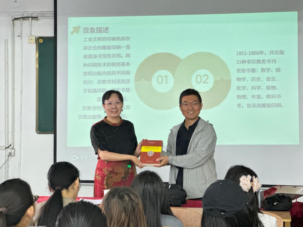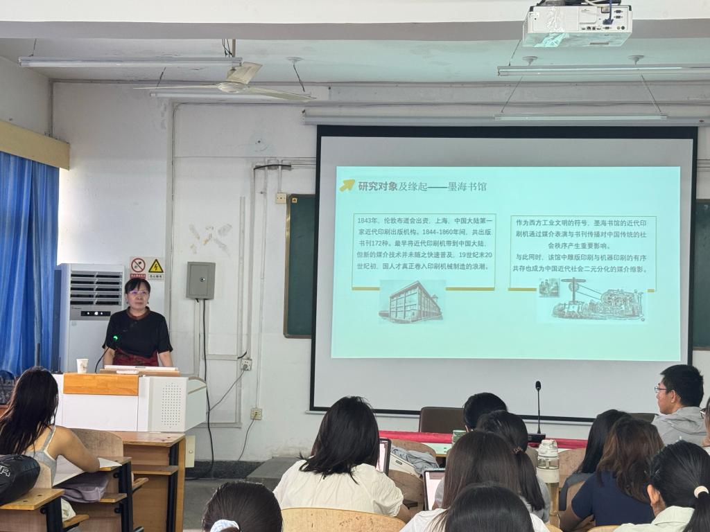 本次讲座主要围绕技术裂变与文化嵌入这一主题展开。程丽红教授以墨海书馆为主要研究对象,向大家展示了印刷技术发展在文化传播中的作用。程丽红教授认为,印刷技术的使用不仅是文化传播的手段,更是权力结构和社会秩序的体现。在探讨印刷机与雕版印刷共存这一现象时,程丽红教授指出工业文明的认知准则与行为逻辑从认知、观念至思潮逐步渗透,试图解构中国传统社会既有秩序,成为构筑半殖民社会场域的配置符号。而作为根植本土的传统印刷技术,雕版印刷在面对印刷机冲击时,凭借社会适配性展现出媒介韧性,这也是其与印刷机在墨海书馆内并存的首要原因;作为清末书籍刊刻主流技术,它在工业印刷机的冲击下未被即刻取代,俨然成为固守传统社会秩序的缩影。当时战争打开国门,殖民主义试图按工业逻辑解构既有规则、重塑场域,中国社会场域通过包容与吸纳,力求将外来元素纳入自身规则体系。媒介的发展正处于这两种场域的张力与互动之中,依托社会结构的变化形成合适的配置,进而明确演进方向。