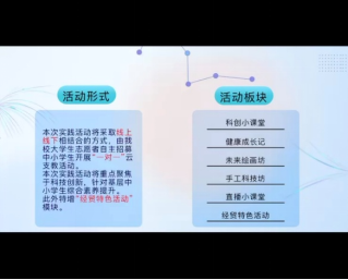 会上,负责人对云支教活动的基本形式进行了介绍,并阐明了其重要性及深远影响,并详细阐述了“科创小课堂”“健康成长记”“未来绘画坊”“手工科技坊”“直播小课堂”“经贸特色活动”六个模块的活动计划与要求,确保参与人员对活动工作要求有清晰的理解。同时,奖惩机制也得到了明确和清晰的说明。