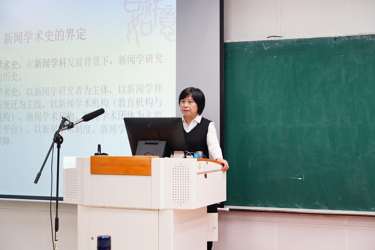 李秀云从新闻学术史的概念界定讲起,深入剖析了中国新闻学的演进脉络以及学术自觉和理论自觉的形成发展过程。通过对黄天鹏所撰写的《新闻运动之回顾——新闻学名论集代序》和《四十年来中国新闻学之演进》两篇文章进行详尽剖析,李秀云重点讲述了中国新闻学的萌芽、建立及发展过程,指出黄天鹏为中国新闻学术史研究第一人。在讲授“中国新闻学术史研究的明确倡导阶段”时,李秀云对徐培汀的“开拓之功”和李彬的“学术视野”进行了重点分析,并介绍了钱辛波所提出的中国新闻学研究的五个发展阶段。她指出,新世纪以来,新闻学者由学术自觉上升为理论自觉,开始新闻学科发展历史的系统总结,多篇博士论文与学术著作的问世,将新闻学术史研究一度推至学术热点。讲座最后,李秀云对中国新闻学术史研究进行了展望,提出基本概念需要厘清、研究视域仍须拓展、研究视角尚须挖掘等观点。