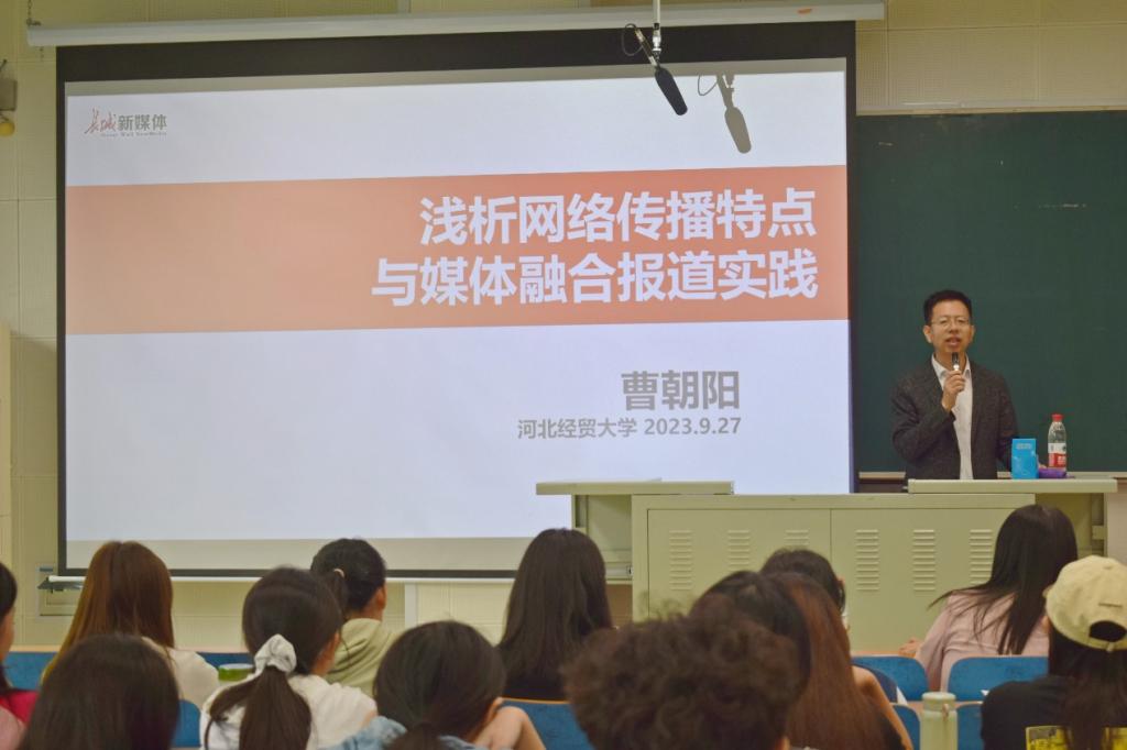 9月27日下午,公司邀请长城新媒体集团时政新闻部、融媒体制作部主任曹朝阳在第三教学楼C310教室作学术讲座,主题为“浅析网络传播特点与媒体融合报道实践”,讲座由经理景义新主持,公司师生120余人参加。