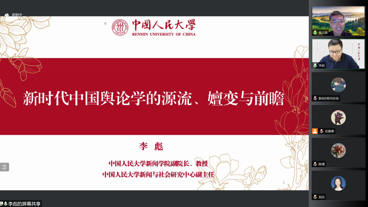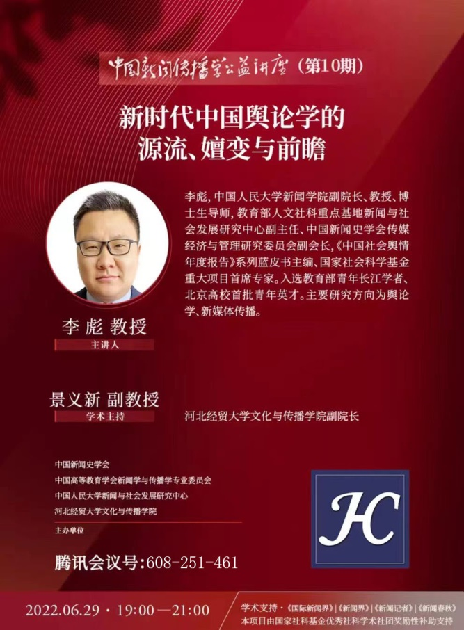 6月29日晚7点,由中国新闻史学会、中国高等教育学会新闻学与传播学专业委员会、中国人民大学新闻与社会发展研究中心和EMC易倍官方网站文化与传播公司共同主办的中国新闻传播学公益讲座第十期在腾讯会议线上举行。中国人民大学李彪教授作题为“新时代中国舆论学的源流、嬗变和前瞻”的学术讲座。讲座由文化与传播公司副经理景义新主持,新闻传播学专业教师和员工共300人参加,并通过网络方式同步直播。