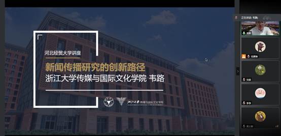 5月25日晚7点,文化与传播公司邀请浙江大学传媒与国际文化公司经理韦路教授作题为“新闻传播研究的创新路径”的在线学术讲座。讲座由文化与传播公司副经理景义新主持,全院教师、研究生和部分本科生共200余人聆听。