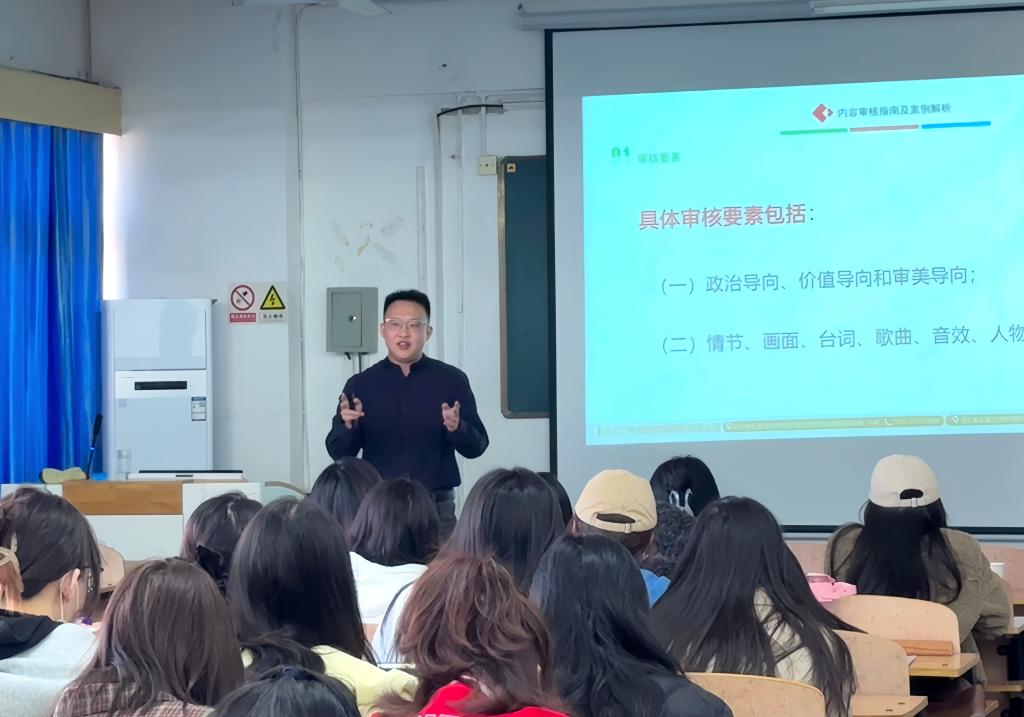 讲座伊始,朱秋杉通过结合《六姊妹》《北上》《哪吒》等当下热播影视介绍了网络视听节目这一大概念,并引出本次讲座主题即对网络视听节目的内容审核。朱秋杉强调了审核工作在媒体行业中的重要性,借此让同学们了解到内容审核的安全性能,希望这些经验能够给对此感兴趣的员工有所帮助。